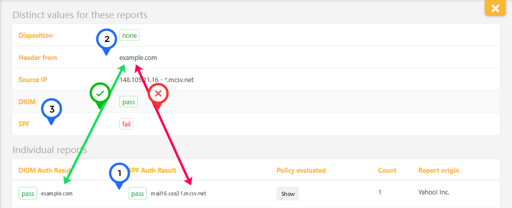 Have a look at the example below. The SPF auth results for hostname mail16.sea31.mcsv.net pass (1), but the hostname does not match the "Header from"-value example.com (2). This causes the DMARC SPF check to fail (3). Please keep in mind that for DMARC to fail, BOTH SPF and DKIM must generate anything other than pass. So in the example below, the message still passes the DMARC validation. SPF can fail when messages are forwarded or are sent from a third-party service. Avoid DMARC failures by adding a DKIM signature to every message sent on your domain's behalf.